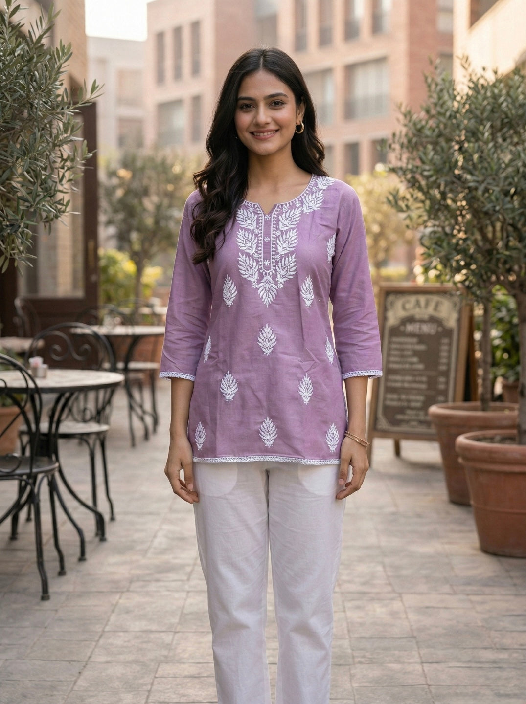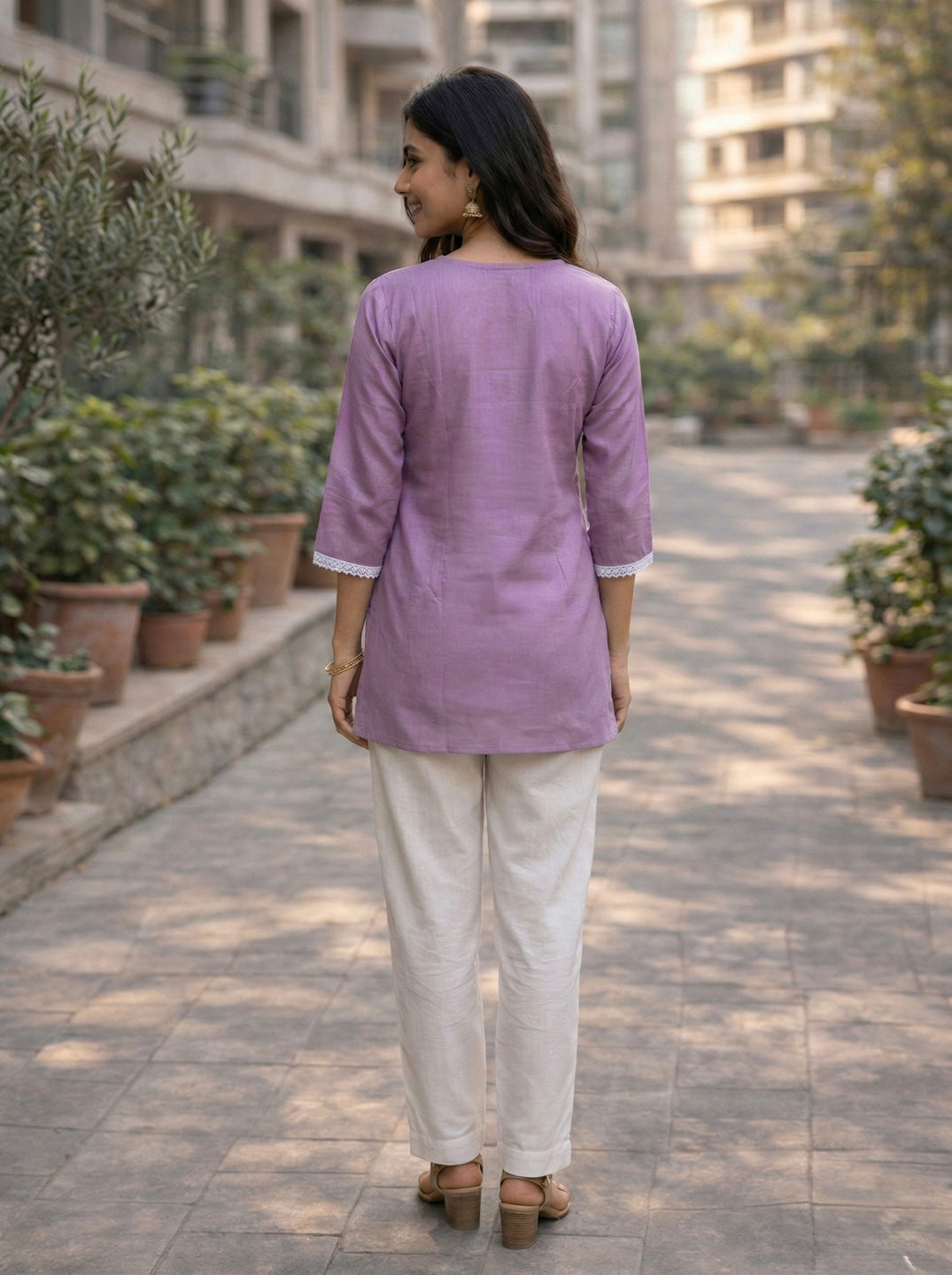 Pair this elegant lavender kurti with white palazzos or leggings and traditional juttis for a graceful ethnic look.