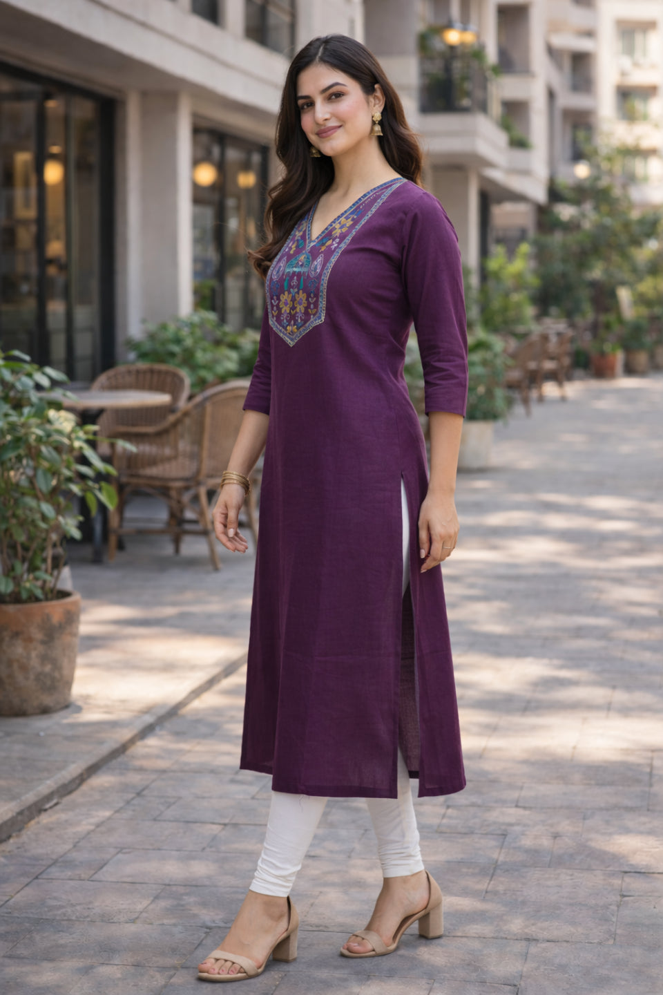 Add elegance to your ethnic wardrobe with this beautiful Women's Purple Embroidered Kurti, designed to combine traditional charm with modern style. Featuring a stylish V-neckline with intricate embroidery, this kurti enhances your overall look while keeping it simple and sophisticated.