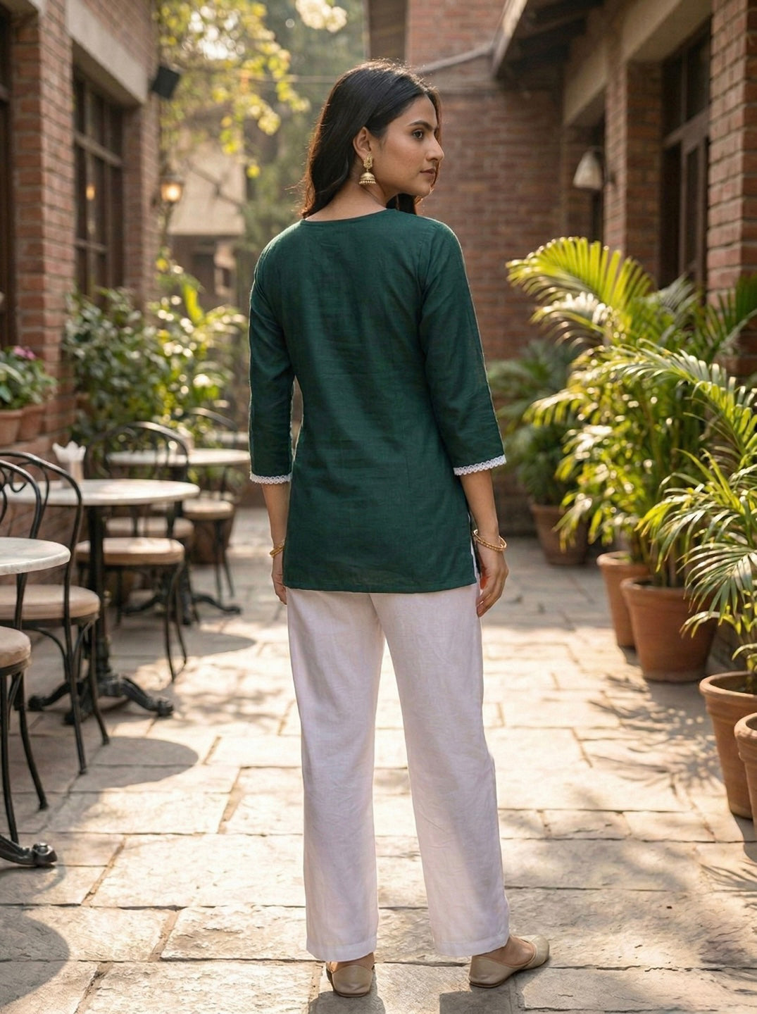 Pair this elegant dark green kurti with white palazzos or leggings and traditional juttis for a classy ethnic look.