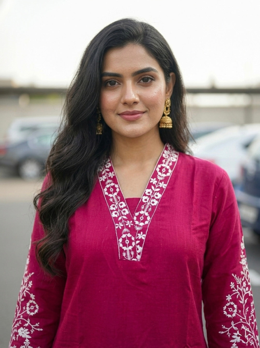 Upgrade your ethnic wardrobe with this beautiful pink embroidered kurta pant set for women. Designed with a graceful V-neckline and delicate embroidery on sleeves, this elegant 2-piece kurta set offers the perfect combination of comfort and style.